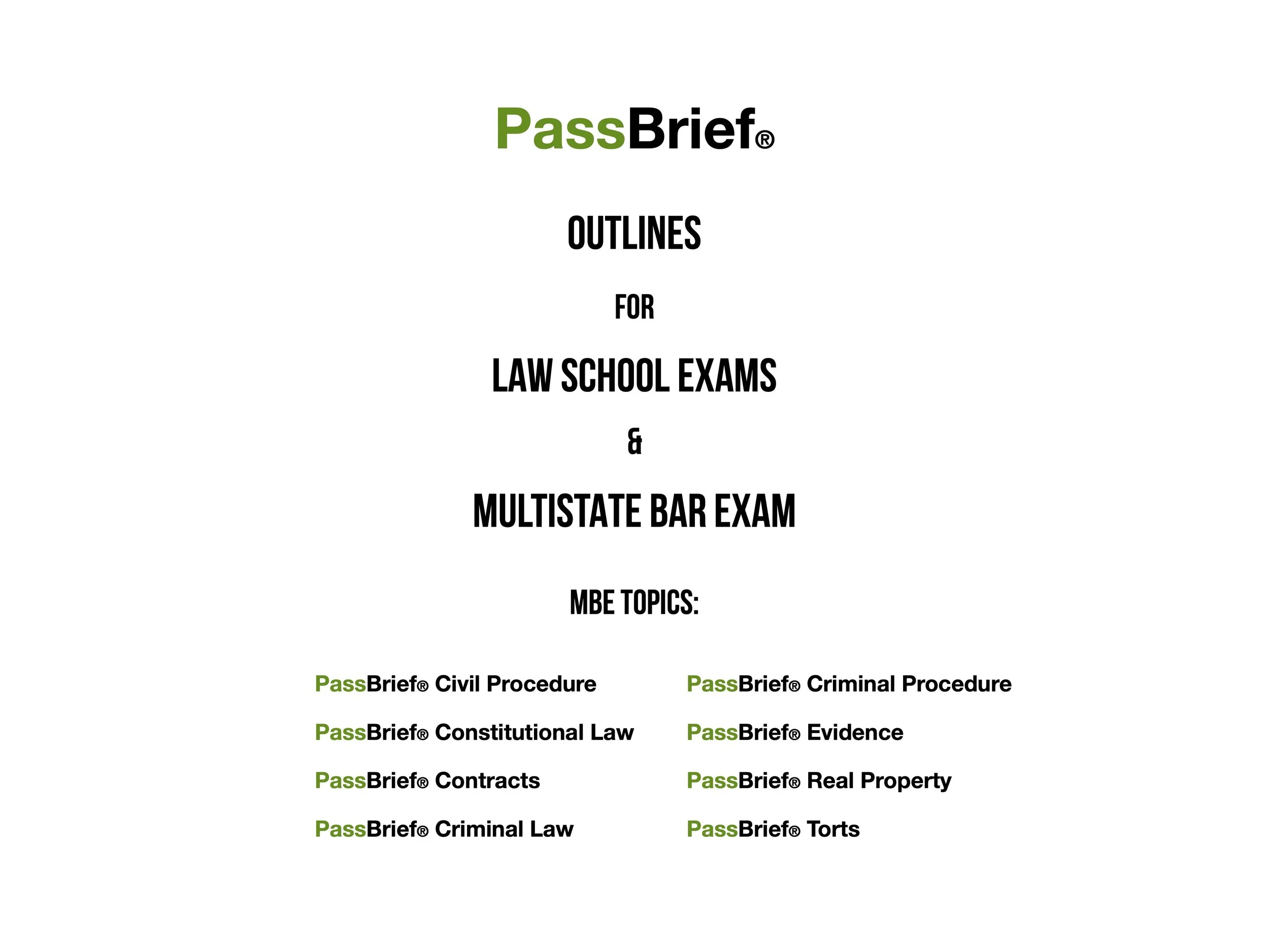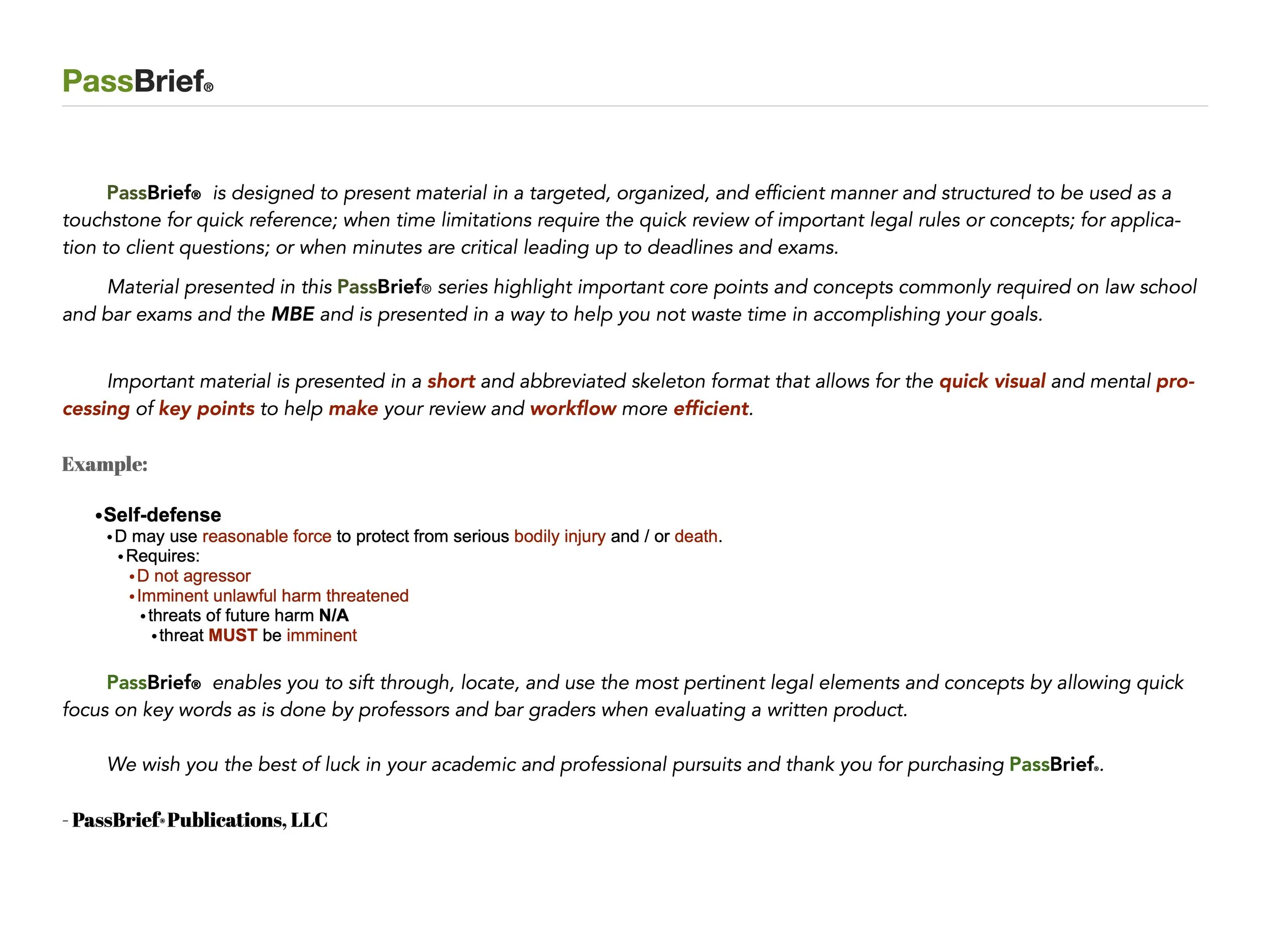 Material presented in this PassBrief® series highlight important core points and concepts commonly required on law school and bar exams and the MBE and is presented in a way to help you not waste time in accomplishing your goals.